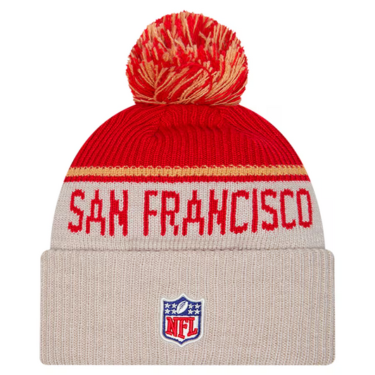 SAN FRANCISCO 49ERS 2024 NFL HISTORIC SIDELINE CUFFED KNIT BEANIE WITH POM - STONE/RED