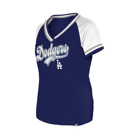 LOS ANGELES DODGERS WOMEN'S GLITTER SCRIPT RAGLAN V-NECK T-SHIRT - BLUE