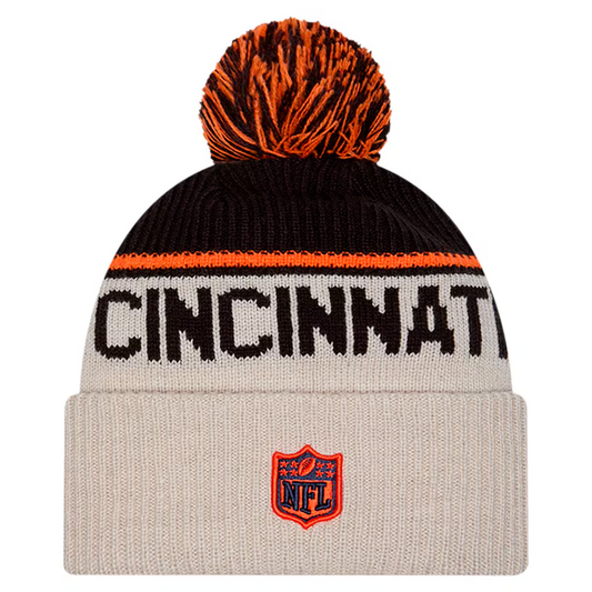 CINCINNATI BENGALS 2024 NFL HISTORIC SIDELINE CUFFED KNIT BEANIE WITH POM - STONE/BLACK
