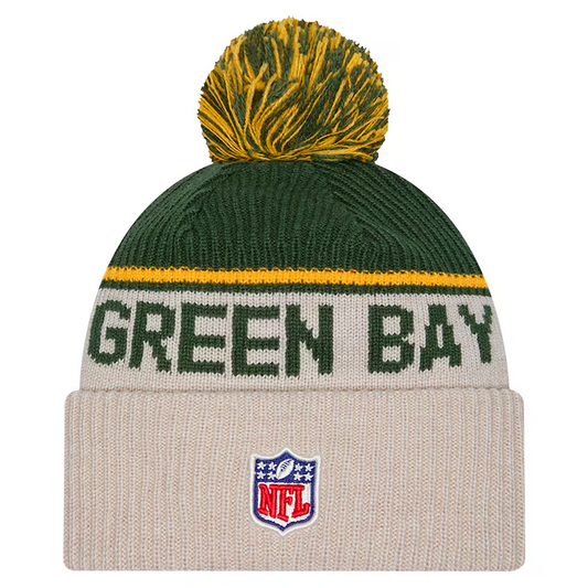 GREEN BAY PACKERS 2024 NFL HISTORIC SIDELINE CUFFED KNIT BEANIE WITH POM - STONE/GREEN