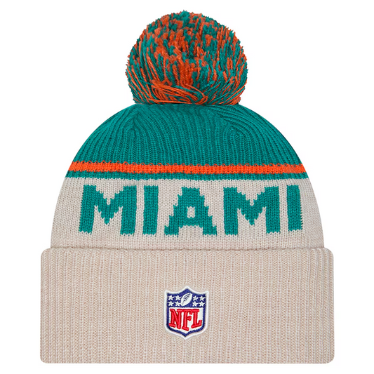MIAMI DOLPHINS 2024 NFL HISTORIC SIDELINE CUFFED KNIT BEANIE WITH POM - STONE/AQUA