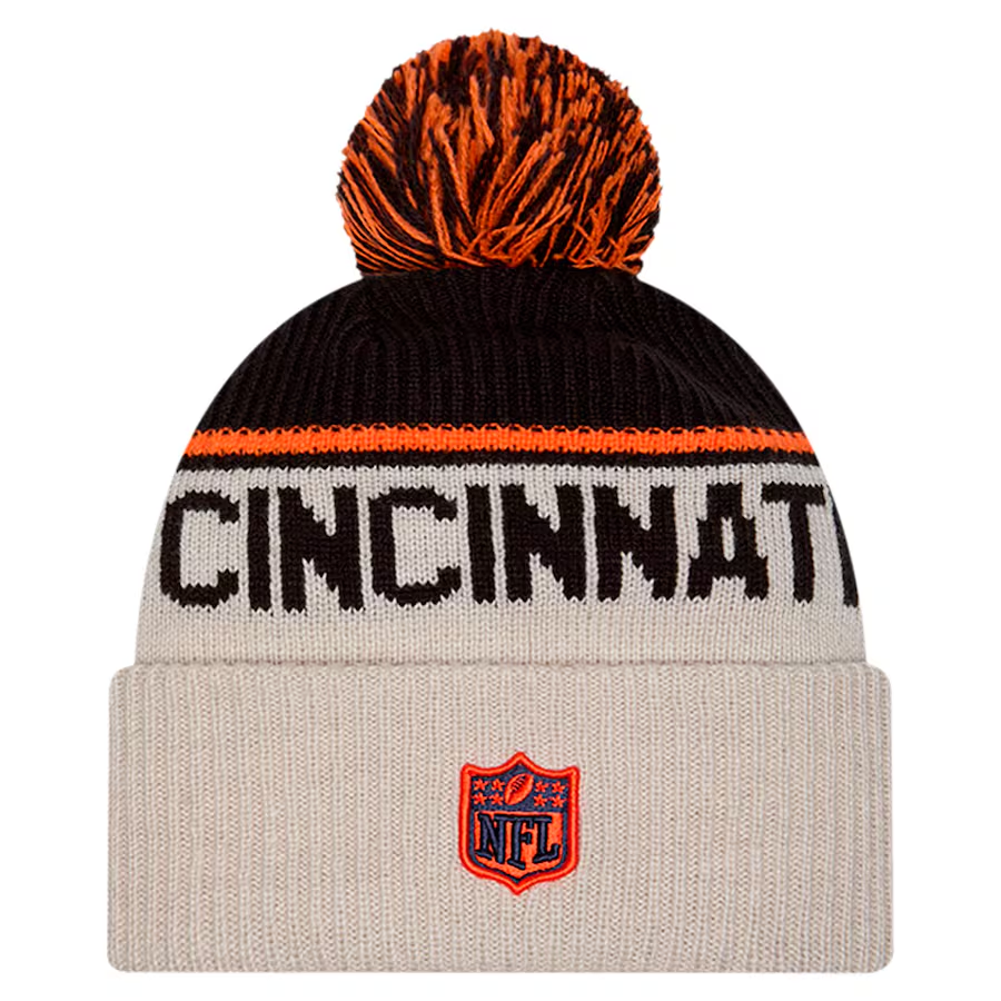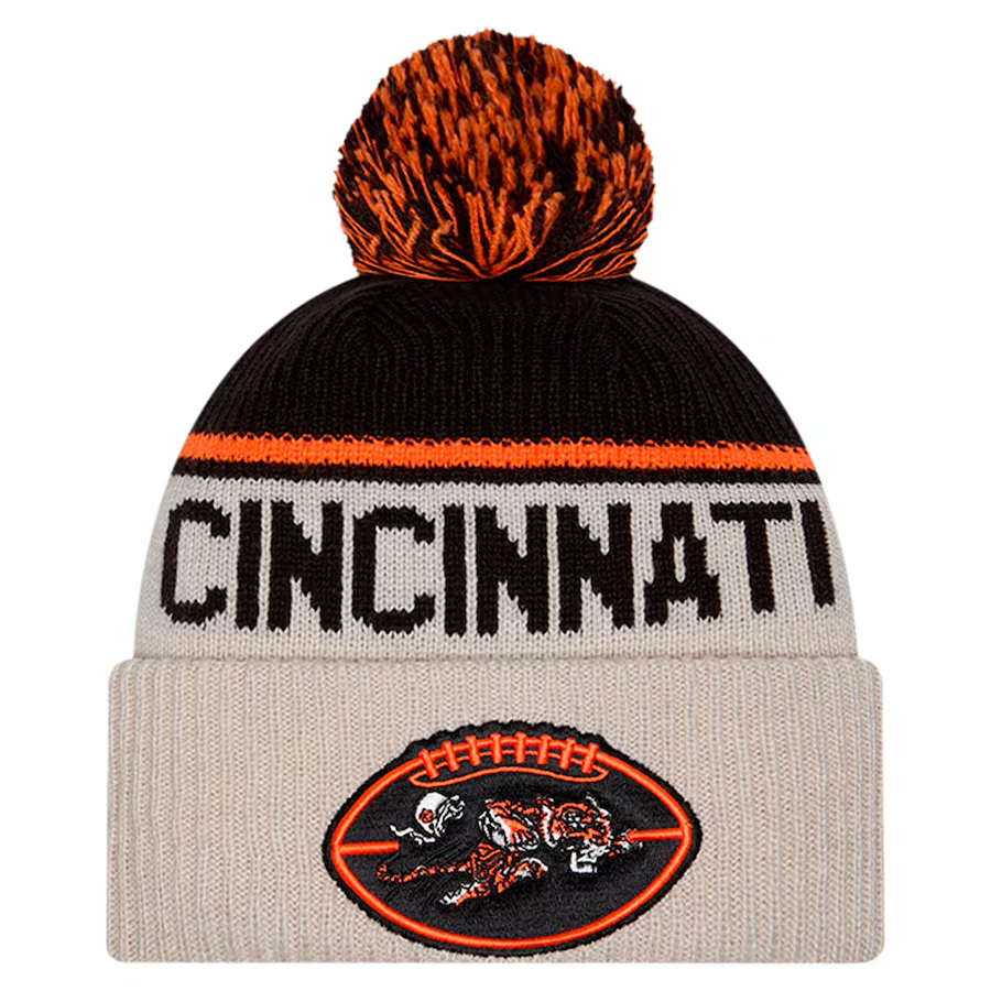 CINCINNATI BENGALS 2024 NFL HISTORIC SIDELINE CUFFED KNIT BEANIE WITH POM - STONE/BLACK