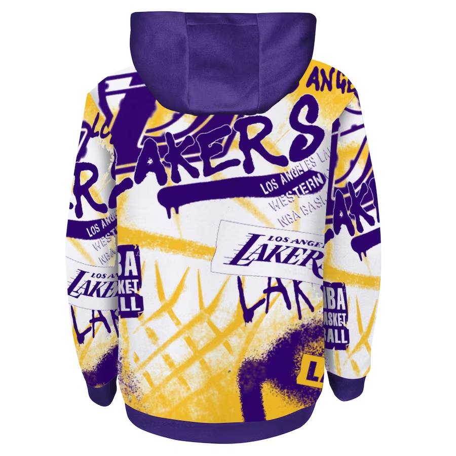 Cheer on the Los Angeles Lakers in style with this Kids Spray Ball Sublimated Hooded Sweatshirt! Featuring a unique graffiti design commemorating the Lakers, it's the perfect way for young fans to show off their team spirit in bold fashion. Ready to show the world your colors? Get yours today!