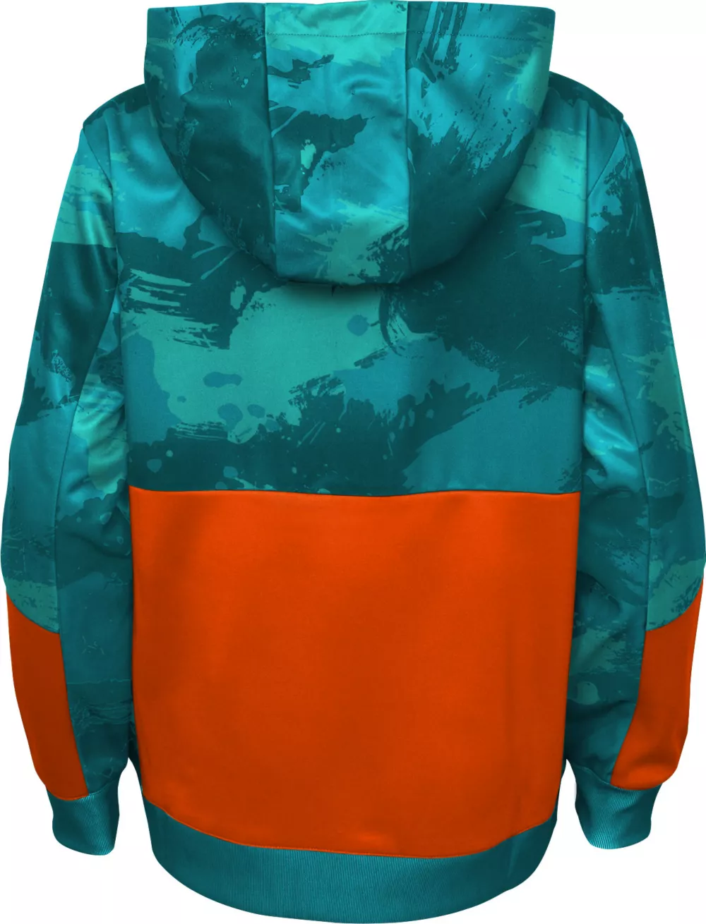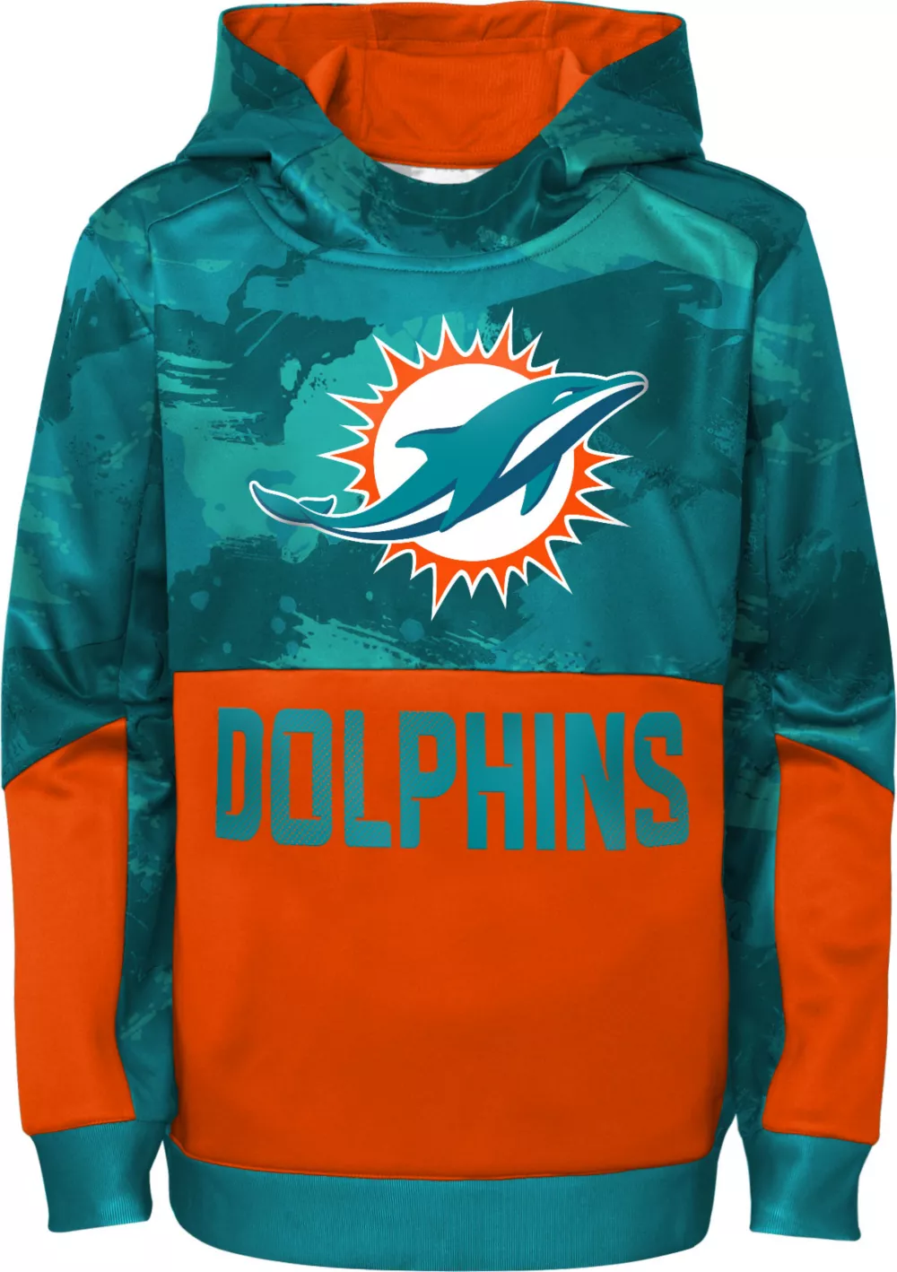 This Miami Dolphins Youth Covert Hooded Sweatshirt combines style and comfort for a perfect boost to your child's game-day wardrobe. It features a 100% polyester construction, a pullover design, and a screen printed team logo and text. Upper body design is sublimated to guarantee a long-lasting design. The awesome team color split design rounds out this ideal hoodie.
