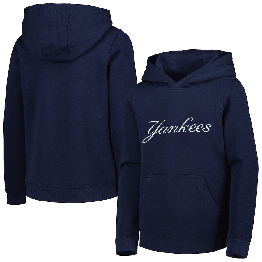 Ensure your young fan is ready for the cooler game days with this New York Yankees Youth Wordmark Pullover Hooded Sweatshirt. This youth-sized hoodie features a simple and unmistakable New York Yankees fan look, making it perfect for any baseball fan. Stay warm and show your team colors with this hoodie.