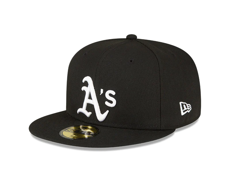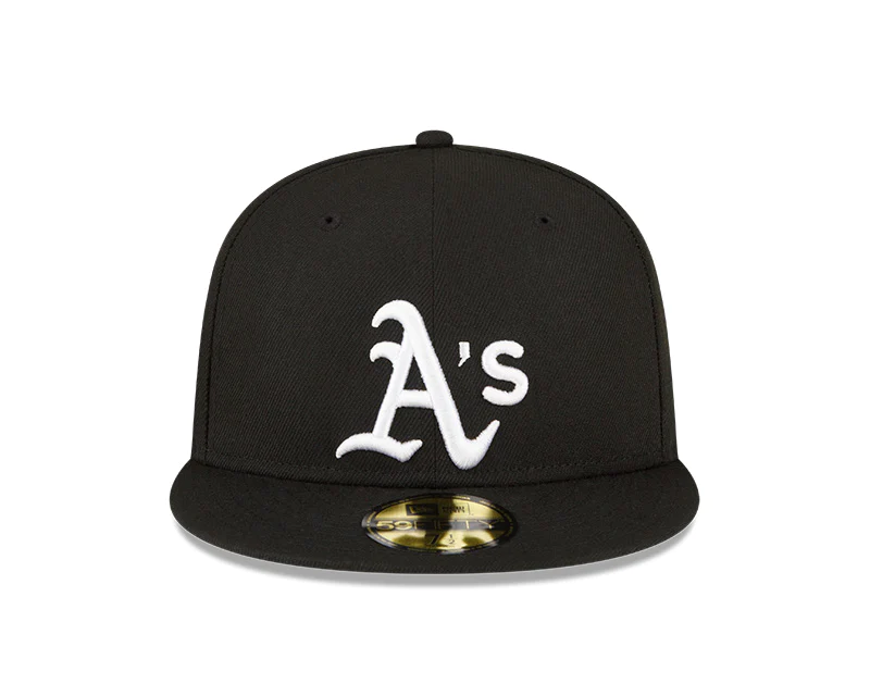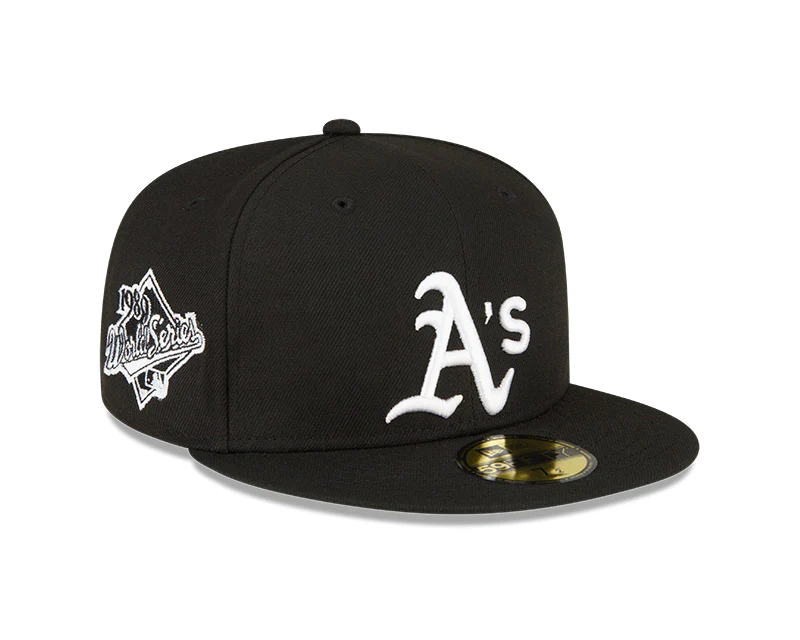 GORRA AJUSTADA 59FIFTY CON PARCHE LATERAL DE LA SERIE MUNDIAL CON PARCHE LATERAL DE OAKLAND ATHLETICS - NEGRO/BLANCO