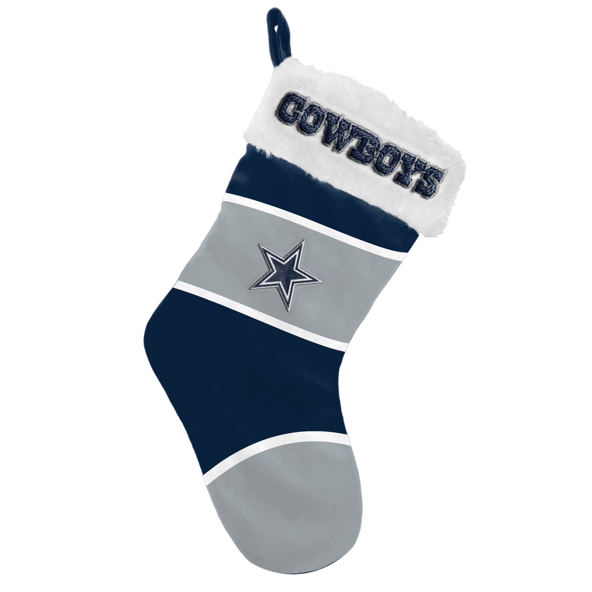 Add a festive touch to your holiday decor with the Dallas Cowboys Embroidered Colorblock Stocking by FOCO. This officially licensed stocking features a tri-color block design in team colors, complete with an embroidered Cowboys script on the faux fur cuff and an embroidered team logo on the stocking itself. Perfect for hanging by the chimney or anywhere in your home, it comes with an attached hook loop for easy display. Celebrate the holidays in style while showcasing your Dallas Cowboys pride—this stocking is a must-have for any dedicated fan looking to combine team spirit with Christmas cheer.