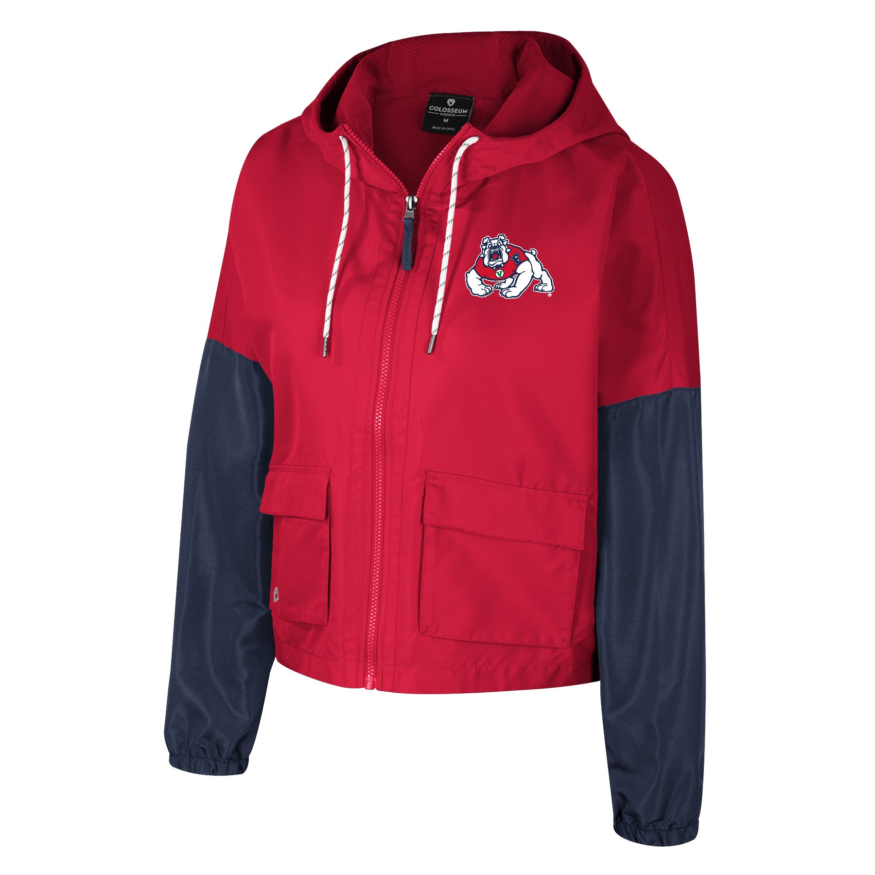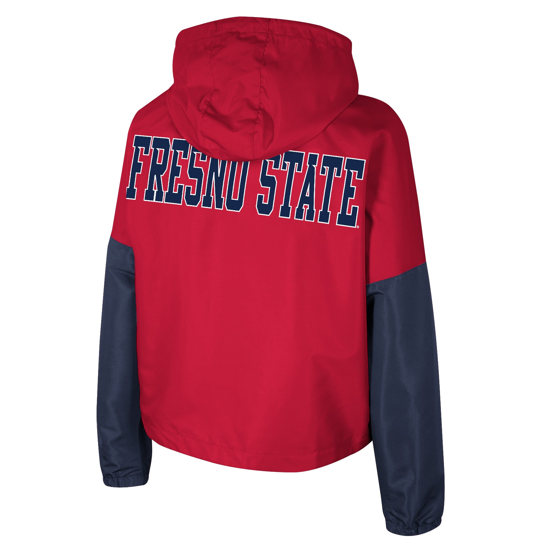 Stay warm and stylish on game day with the Fresno State Bulldogs Women's Rafi Pullover Hooded Windbreaker Jacket. This cute and fashionable jacket features a full-zip enclosure, two-tone sleeve design, and a drawstring hood with white drawstrings. Perfect for colder, wet conditions, it's a must-have for any Fresno State fan.