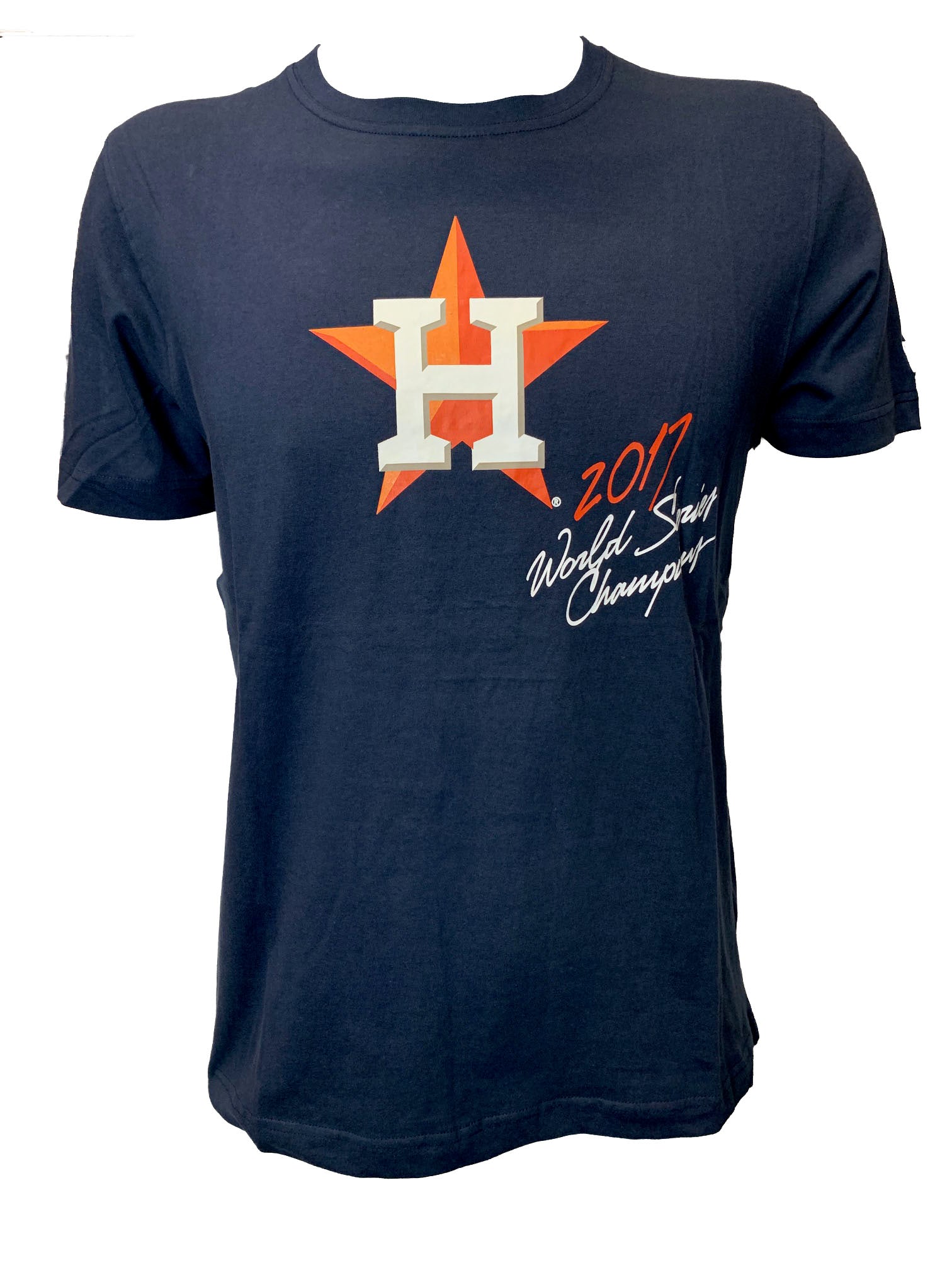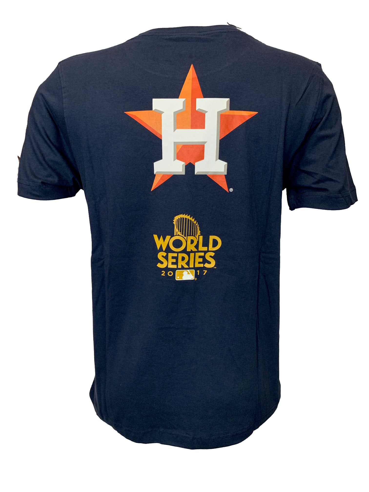 The Houston Astros World Champions short sleeve t-shirt features a screen-printed Astros logo at the chest with a World Series script below, celebrating the franchise's legacy. Additional details include a team logo at the back with World Series patches screen-printed below.