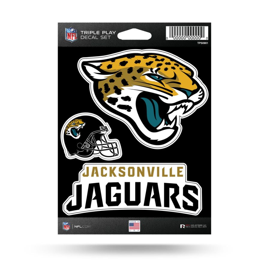 Show off your Jacksonville Jaguars loyalty with this 3-piece decal set! Featuring vinyl decals ranging from 2”-4”, these stickers are perfect for decorating your car, laptops, and water bottles. Make a statement with the Jacksonville Jaguars Triple Play Decal Set.