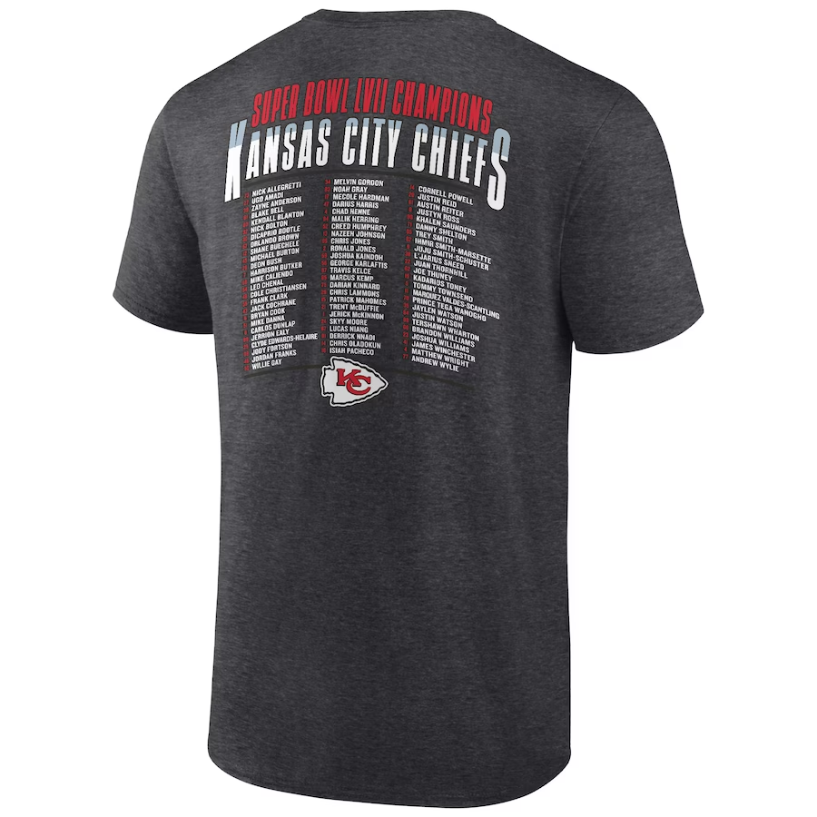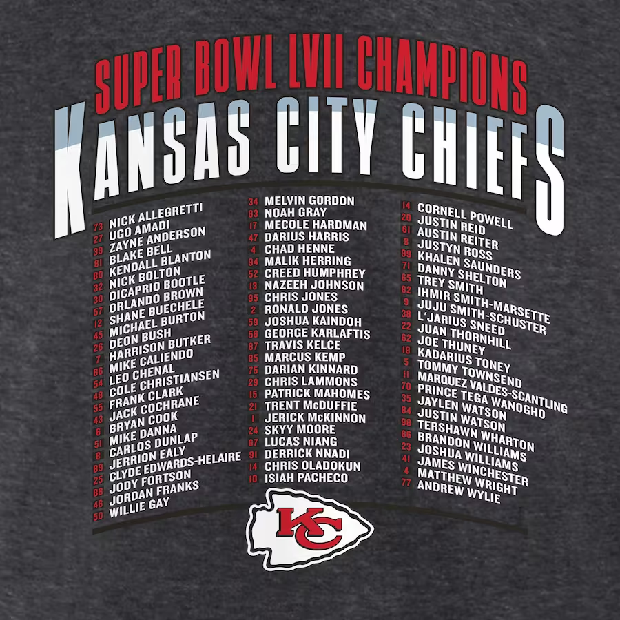 Celebrate the Super Bowl LVII Champions with this officially licensed t-shirt! Printed with the Kansas City Chiefs roster on the back, you'll proudly show off the team that made the cut! Show off your love for the Chiefs with this one-of-a-kind Super Bowl LVII Champs t-shirt! Go Chiefs!