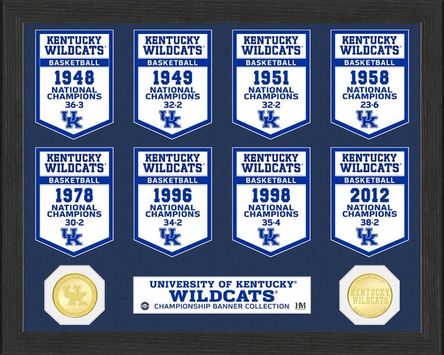 This unique collectible frame features two minted coins and replicas of your favorite college team the Kentucky Wildcats' championship banners hanging in their stadium. Featured in a 12” x 15” wood frame with double matting is a replica of the Championship Banners for each National Championship. Matted below the banners is a minted 39mm team logo coin and a 39mm commemorative coin. Each frame is accompanied by a Certificate of Authenticity. Officially Licensed by the CLC and proudly made in the USA by The Highland Mint!