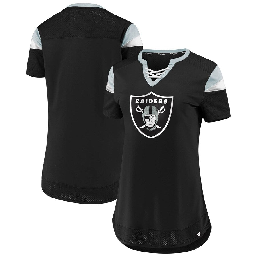 Show your team allegiance in style with the officially licensed Las Vegas Raiders Women's Draft Me Fashion T-Shirt. This lightweight and premium soft material t-shirt features a cross lace V-neck design, making it perfect for game day fashion. Show your team spirit with a fashionable jersey that is sure to make an impression.