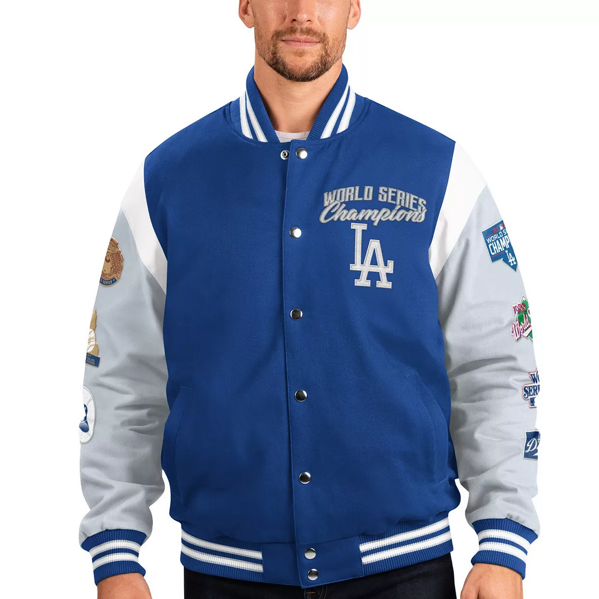 Add an exciting piece of Los Angeles Dodgers apparel to your rotation with this Franchise full-snap varsity jacket from G-III Sports by Carl Banks. It features embroidered graphics along the sleeves and on the back that commemorate the team's World Series titles, making it perfect for die-hard Los Angeles Dodgers fans. Several interior and exterior pockets make it easy to store away all of your game day essentials.