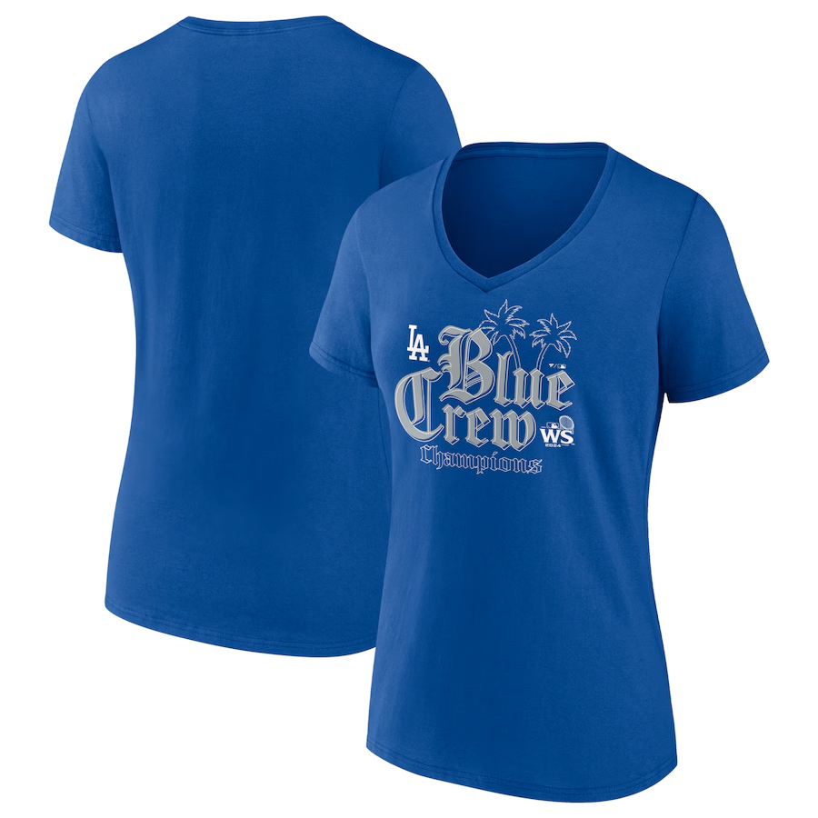Celebrate the Los Angeles Dodgers' stunning 2024 World Series victory with this Los Angeles Dodgers Women's 2024 World Series Champions Trophy Case Addition T-Shirt from Fanatics Branded Apparel. Made from 100% premium cotton, this short sleeve, V-neck tee offers both comfort and style for every Dodgers fan. The shirt features a vibrant, unique screen-printed design on the front, showcasing the Blue Crew design with 2024 World Series Champions logo graphics along and palm tree motif, blending the excitement of the championship with California’s signature style. Perfect for game day, casual wear, or as a standout addition to your Dodgers collection, this officially licensed t-shirt is a must-have for every fan who wants to celebrate this championship season.