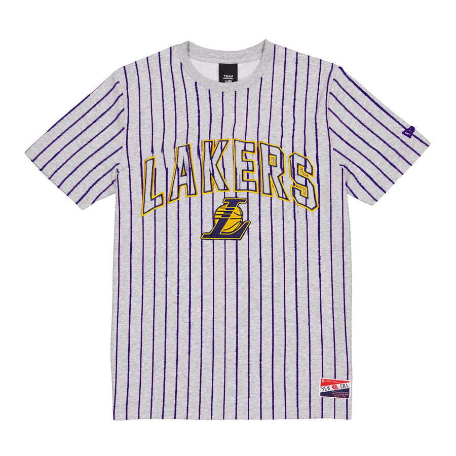 Get ready to show your team spirit with this Los Angeles Lakers Men's Throwback Pinstripe T-Shirt! Made by New Era, this licensed Lakers tee features the iconic pinstripe design and the bold Lakers logo. Perfect for game day or everyday wear, this gray shirt is a must-have for any true fan!
