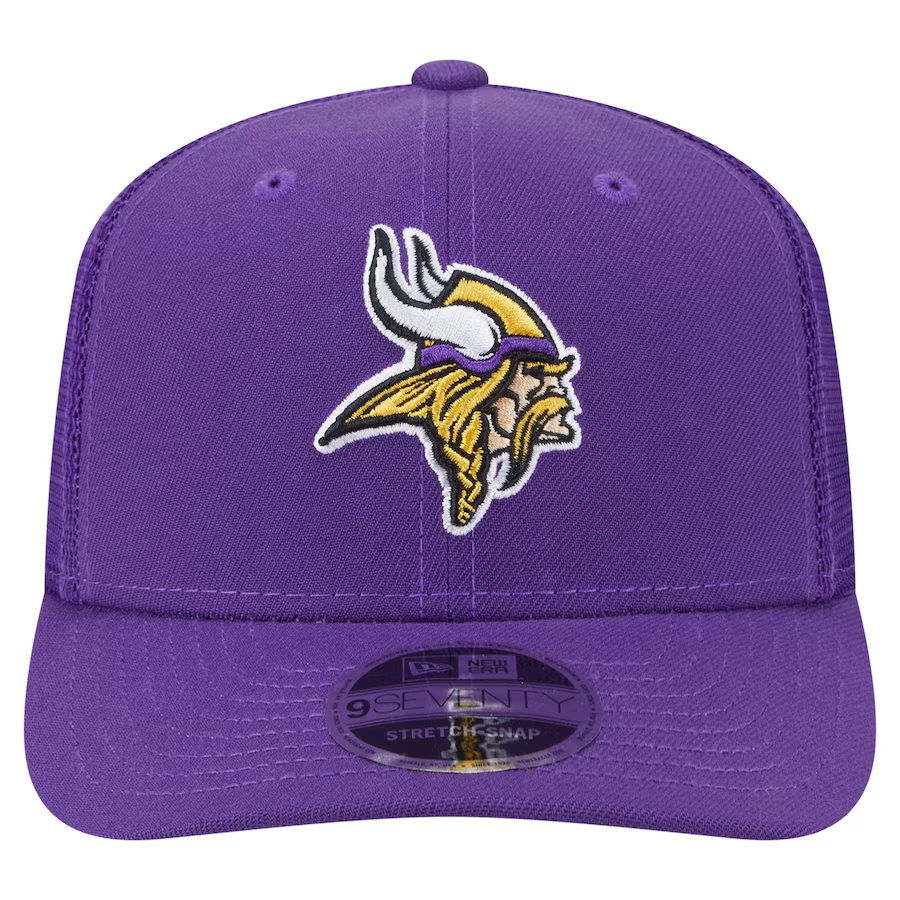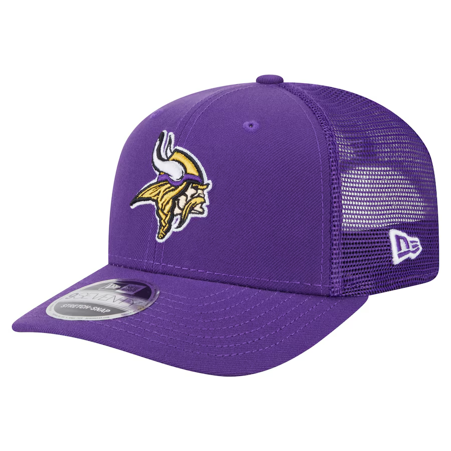 Show your team spirit with the Minnesota Vikings Team Collection 9SEVENTY Stretch Snap Adjustable Hat by New Era. Made from 100% polyester, this Minnesota Vikings hat features a modern stretch snap design for a secure, adjustable fit and all-day comfort. The breathable trucker mesh back panels and slightly curved brim offer a classic trucker hat style, while the raised embroidered Minnesota Vikings logo on the front adds bold team flair. With its one-size-fits-most construction and officially licensed design, this Minnesota Vikings snapback hat is a great choice for fans looking for comfort, style, and a game day-ready look.