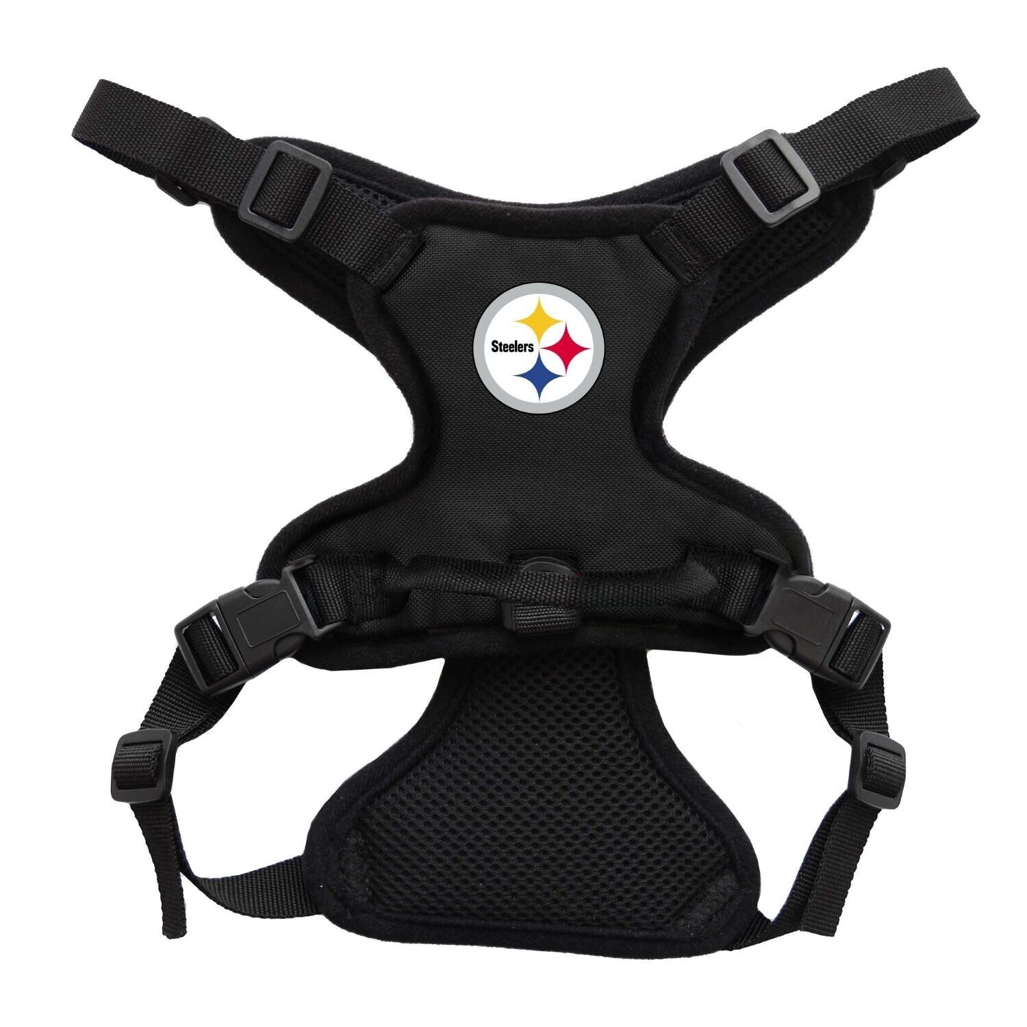 Get your furry friend dressed for the big game with the Pittsburgh Steelers Pet Harness. Designed for extra security, this harness features two adjustable front clips and a back handle. Show your team spirit with the embroidered team logo and league patch. This harness is the perfect way to keep your pet safe and let them show off their fandom.