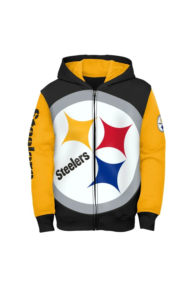 Cheer on the Pittsburgh Steelers in style with the Youth Poster Board Zip-Up Hooded Sweatshirt! Featuring a large screen-printed design, your little one will stay warm and look great on game days. Perfect for Youth Steelers fans, this zip-up hoodie is sure to be an instant hit!