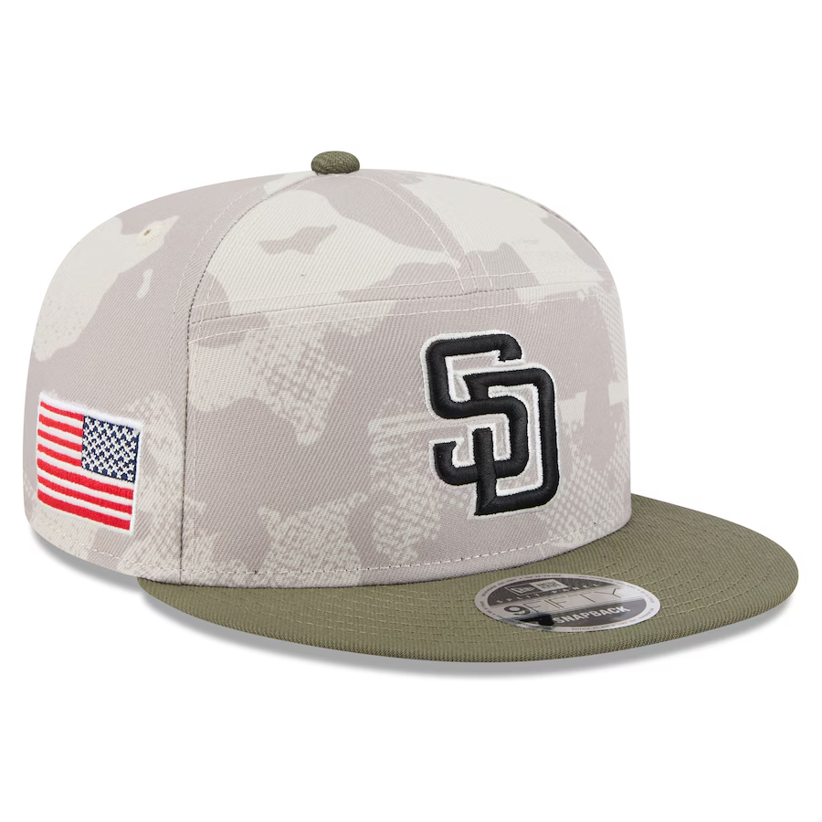 Show your team and country pride with the San Diego Padres 2025 MLB Armed Forces 9FIFTY Snapback Hat by New Era. This officially licensed 9FIFTY snapback features a fully adjustable fit and a bold two-tone camo design in stone and olive, honoring military service in true baseball style. Made from 100% polyester, it includes split front panels, a raised embroidered San Diego Padres logo, and an embroidered USA flag patch on the side. Part of the official 2025 MLB Armed Forces collection, this San Diego Padres snapback hat is a standout accessory for any fan looking to support their team with a patriotic edge.