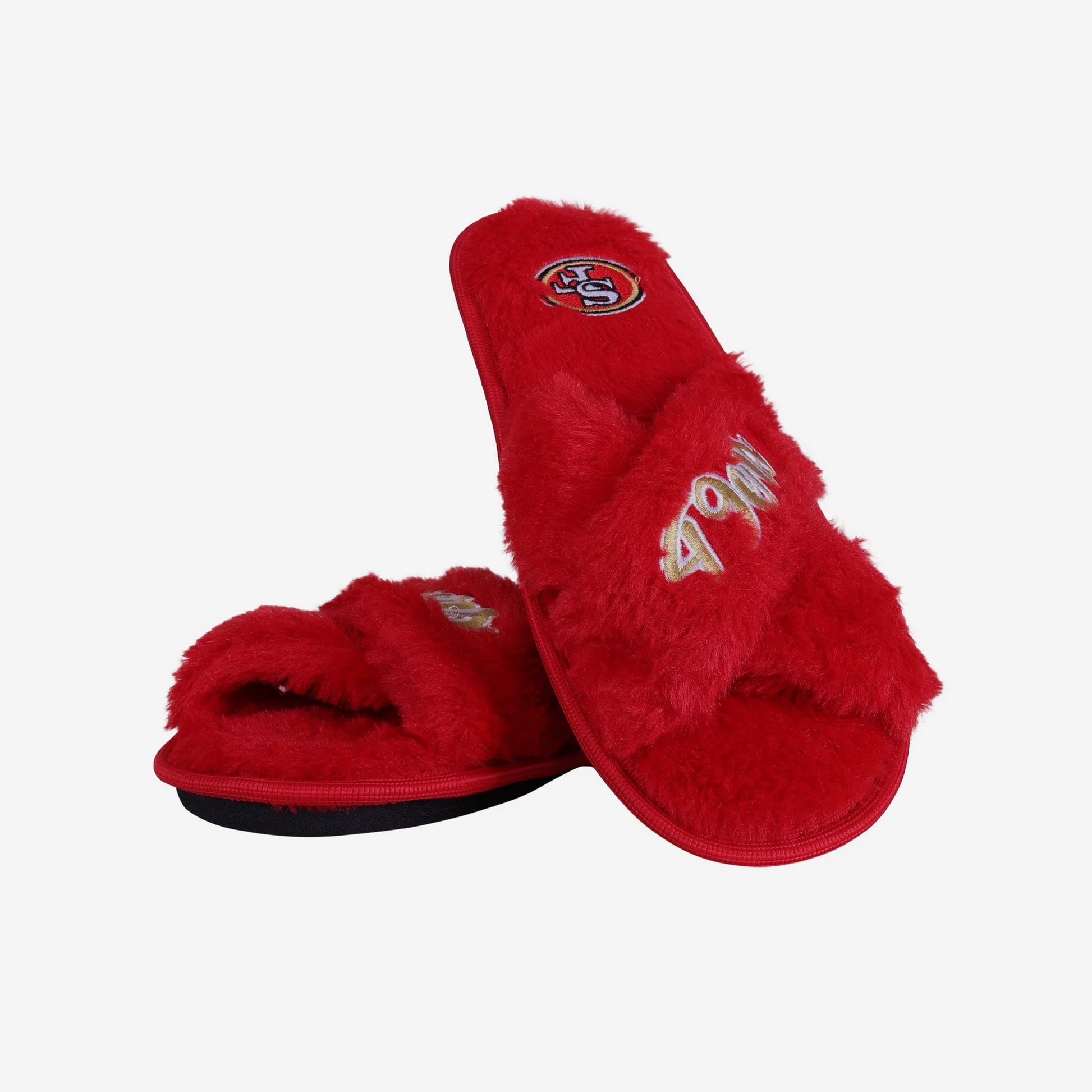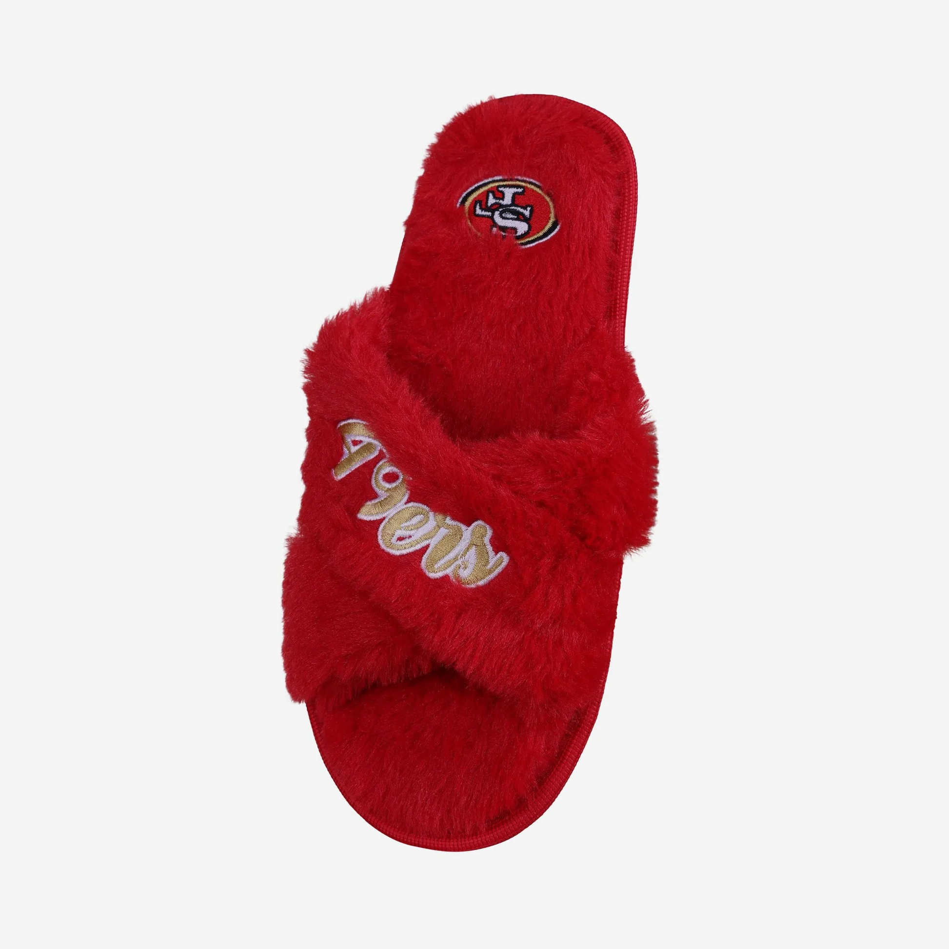 Step into comfort and team spirit with the San Francisco 49ers Women's Script Cross Slippers by FOCO. Designed for cozy nights and casual lounging, these officially licensed NFL slippers feature a soft faux fur lining, cushioned EVA and polyurethane foam filling, and a stylish cross-band slide design that’s easy to slip on and off. The bold embroidered San Francisco 49ers script graphic adds the perfect fan touch, while the textured outsole provides extra grip on indoor surfaces. Made with a 100% acrylic upper and built for everyday comfort, these 49ers women's slippers combine team pride with a warm, snuggly fit. Grab your pair before they're gone and rep the Niners in comfort all season long.