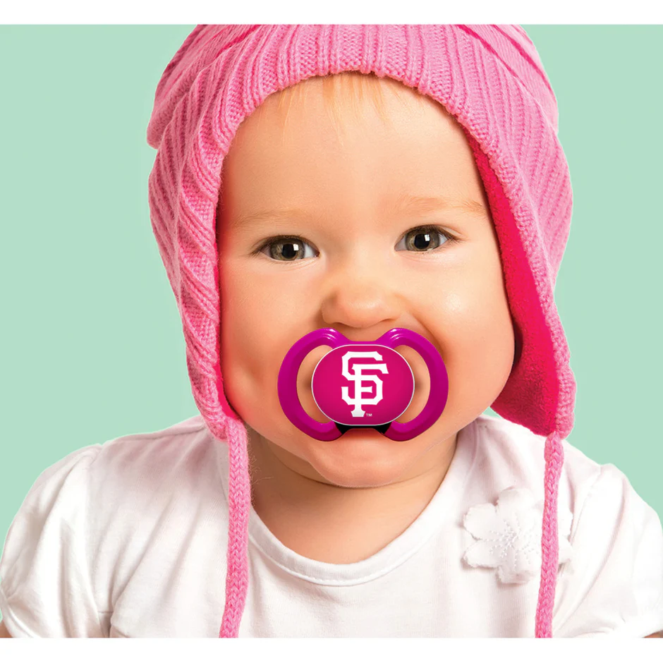 Support your team from the start with the San Francisco Giants 2-Pack Pacifiers. These BPA-free pacifiers feature a pink plastic shield and orthodontic silicone nipple for your baby's comfort. The San Francisco Giants logo is proudly displayed on the "button" and pink shield, making it perfect for any young fan. Soothe your baby in true NFL fashion!
