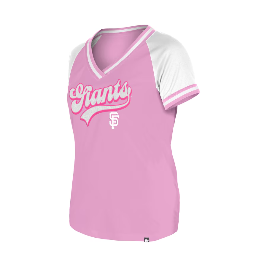 SAN FRANCISCO GIANTS WOMEN'S GLITTER SCRIPT RAGLAN V-NECK T-SHIRT - PINK