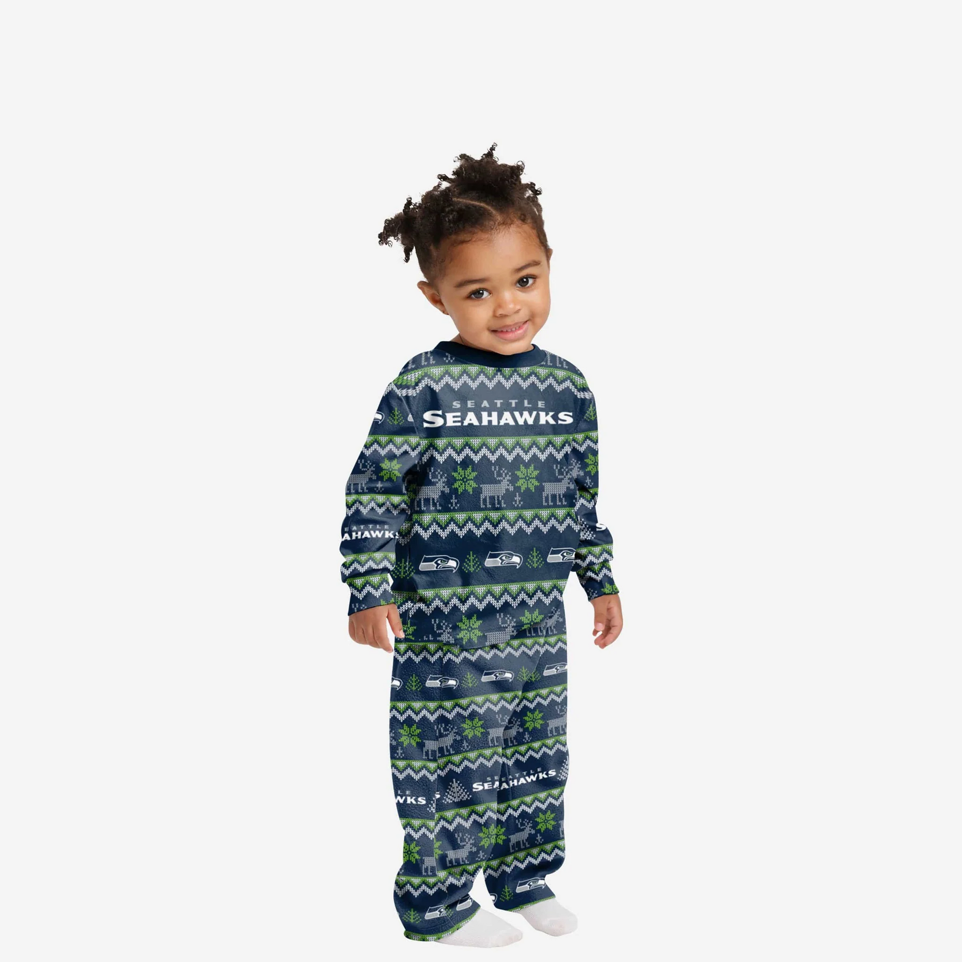Let your little one show their team spirit in these holiday themed Seattle Seahawks Toddler All Over Print Pajamas. The top and pant design features multi-logo designs and ultra soft polyester for superior comfort and warmth.