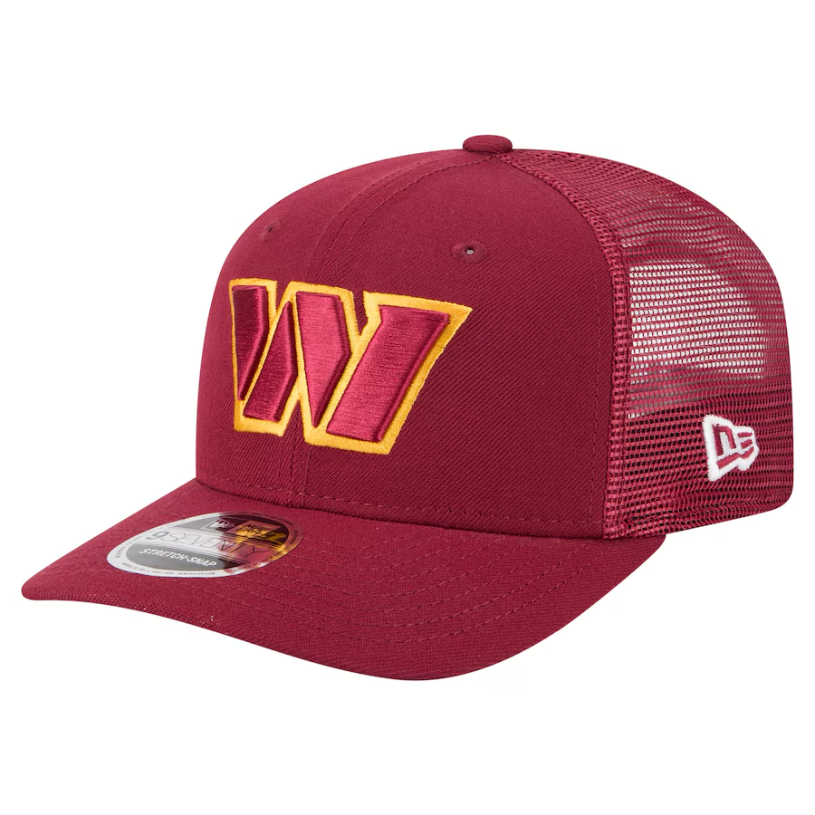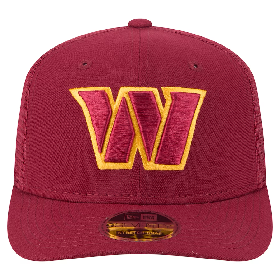 Show your team spirit with the Washington Commanders Team Collection 9SEVENTY Stretch Snap Adjustable Hat by New Era. Made from 100% polyester, this burgundy Washington Commanders hat features a modern stretch snap design for a secure, adjustable fit and all-day comfort. The breathable trucker mesh back panels and slightly curved brim offer a classic trucker hat style, while the raised embroidered Washington Commanders logo on the front adds bold team flair. With its one-size-fits-most construction and officially licensed design, this Washington Commanders snapback hat is a great choice for fans looking for comfort, style, and a game day-ready look.