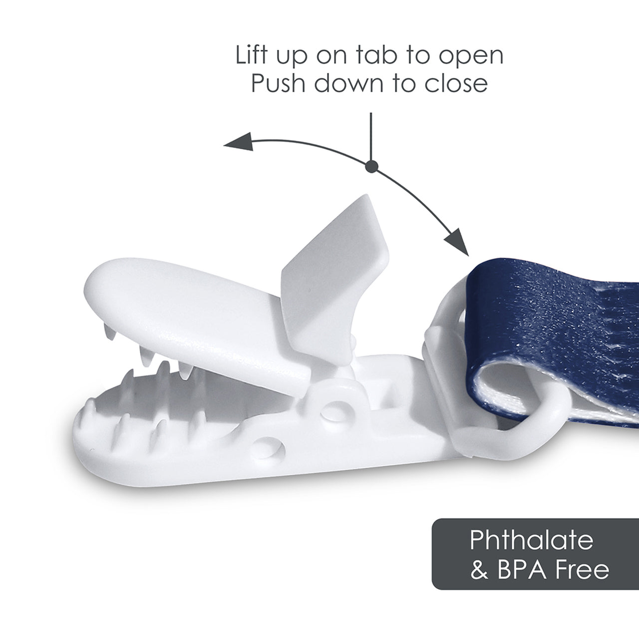 Elevate your baby's game day style with the New York Yankees Pacifier Clip set. These high grip clips keep pacifiers securely in place while showing off team spirit. Eye-catching team logos on both sides and a long string for any size pacifier make this set a must-have for any MLB fan.